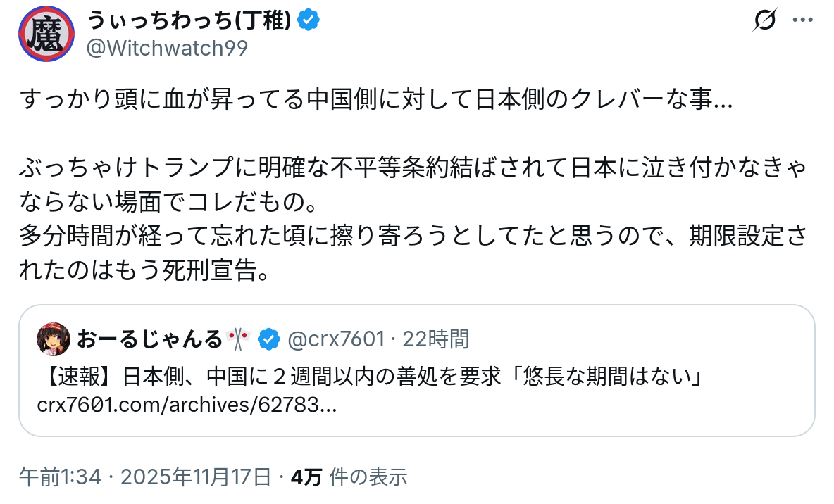 | … | 48無念Nameとしあき25/11/17(月)13:31:34No.1366765562そうだねx1>高市総理「2週間だけ待ってやる」 |