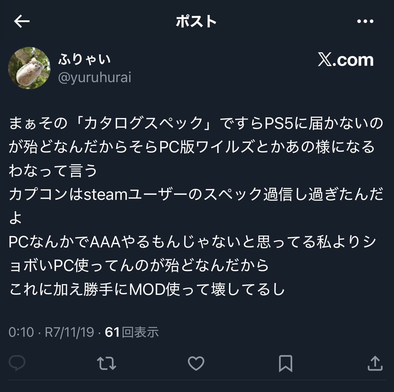 | … | 60無念Nameとしあき25/11/19(水)00:10:23No.1367116171+>あーあワイルズの為にテレビとPS5proとワイルズ買ったのに・・・ |