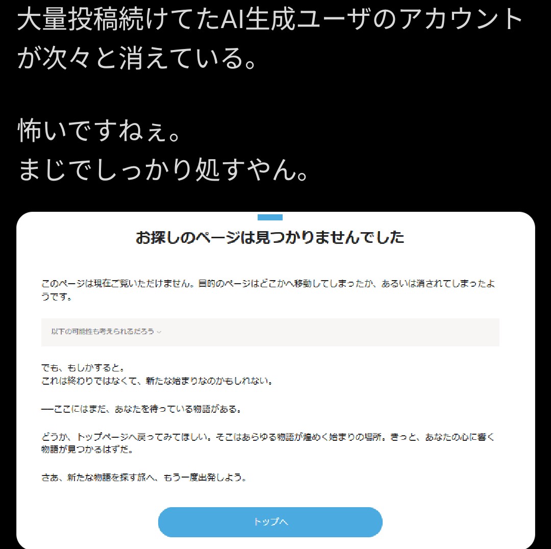 | … | 169無念Nameとしあき25/11/19(水)20:07:27No.1367276358そうだねx1禁止するなら「AI使ってるような気がしたらBANします」と言うしかないからな |