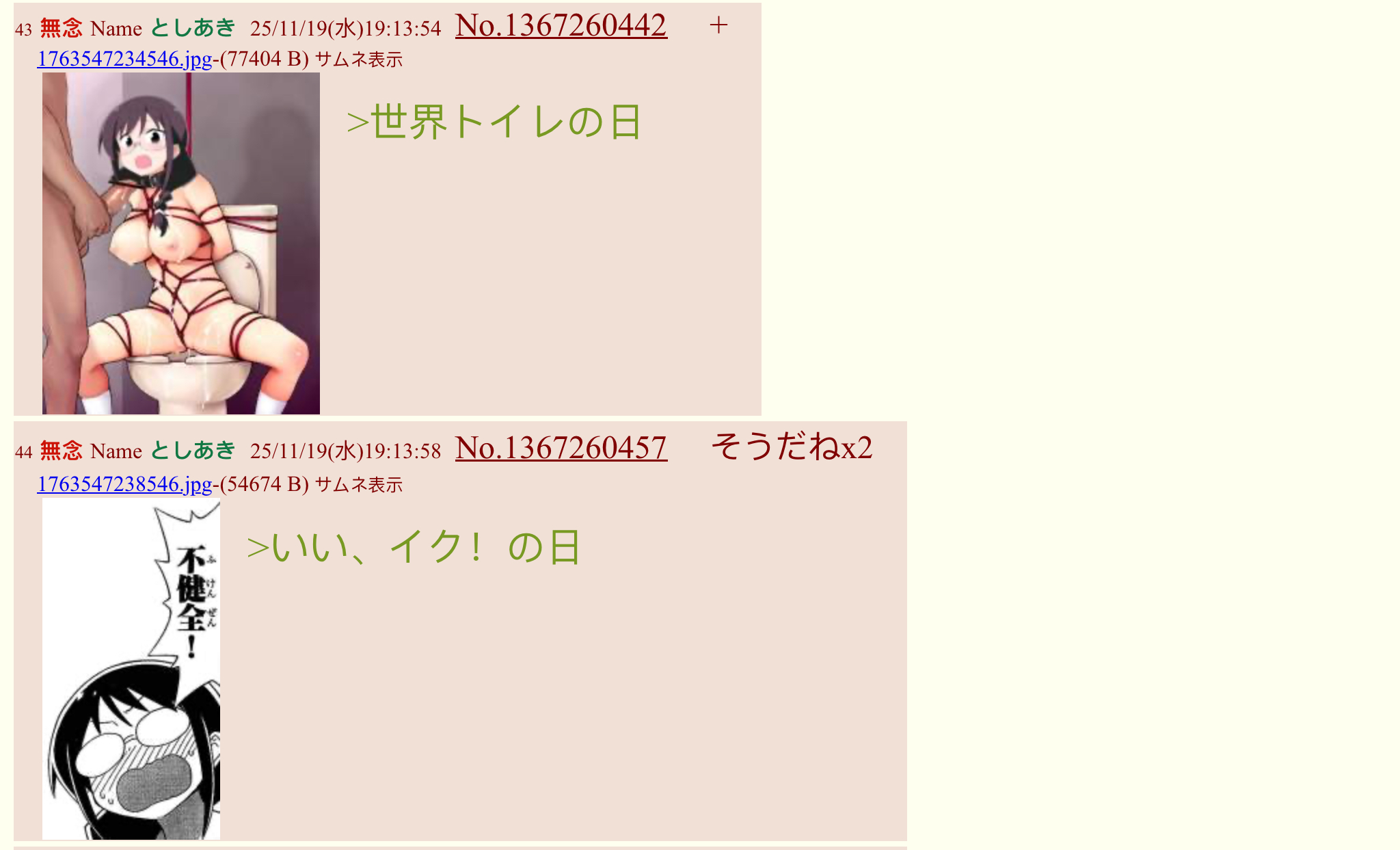 | … | 51無念Nameとしあき25/11/19(水)19:22:42No.1367262893+>>>異世界トイレの日ですって |