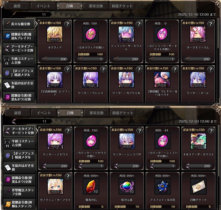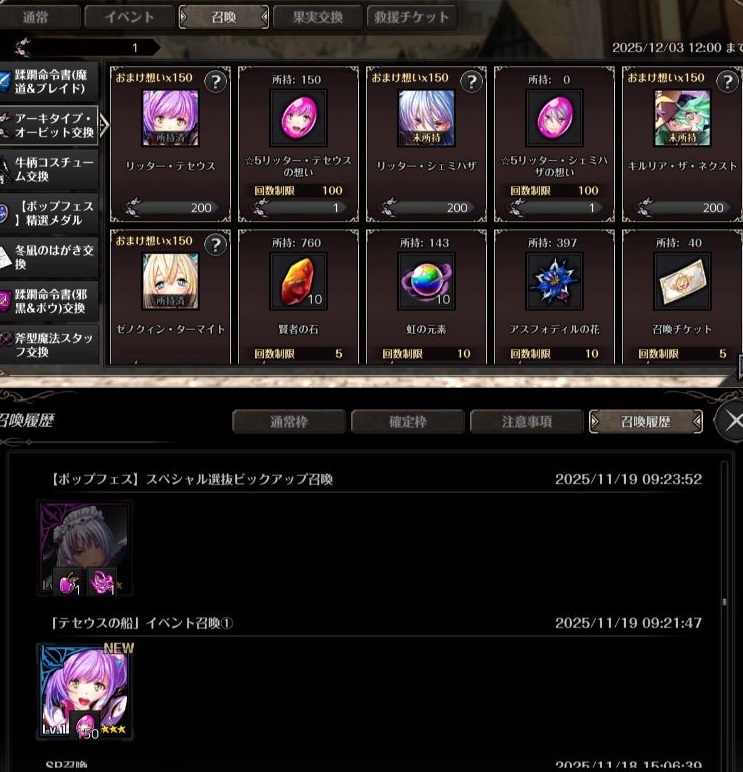 | … | 194無念Nameとしあき25/11/19(水)20:15:54No.1367279104+フェスで途中でリュノンとグレース引いて残り20だから天井したやつの交換に迷ってるうちにもう期限が近いツァ |