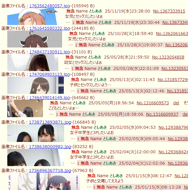 | … | 56無念Nameとしあき25/11/20(木)07:18:07No.1367370657+>女児とセックスしたいよぉ |
