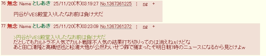 | … | 17無念Nameとしあき25/11/21(金)08:36:38No.1367590322そうだねx2昨夜のウルトラマン粘着スレで一連のクソスレ乱立してるのお前だってバレてたな |