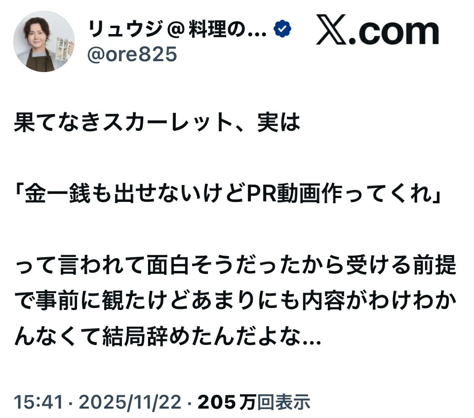 | … | 53無念Nameとしあき25/11/25(火)08:46:52No.1368599601+>そもそも料理研究家おじさんにPR頼む意味が分かんないし |