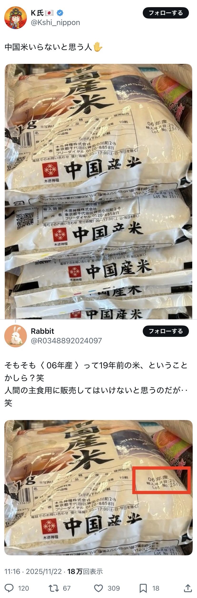 | … | 12無念Nameとしあき25/11/26(水)20:47:25No.1368952373そうだねx1中国産のコメは食いたくないけど輸入年月日25年って書いてあるのが見えるんですが |