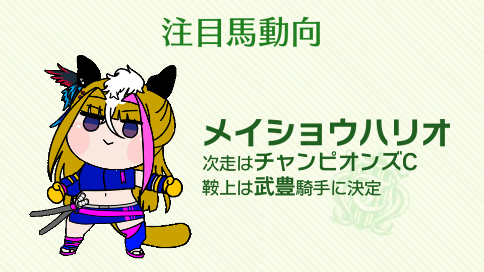 | … | 8無念Nameとしあき25/11/27(木)00:59:09 ID:TDMWOrAMNo.1369013366+ 1764172749513.png-(529584 B) メイショウハリオはチャンピオンズCで武豊騎手と組みます |