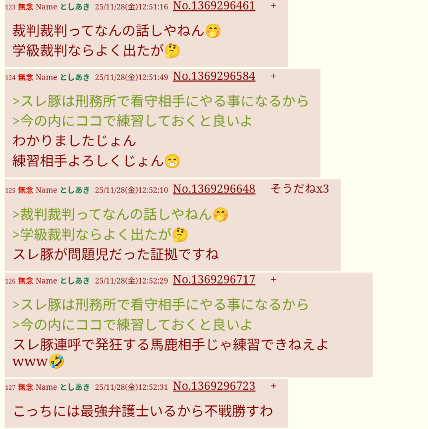 | … | 113無念Nameとしあき25/11/28(金)13:47:47No.1369305498そうだねx7 1764305267653.png-(93630 B) いいかスレ豚?裁判所からの手紙は破らずにちゃんと読めよバーカ |