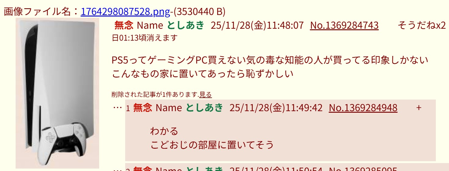 | … | 33無念Nameとしあき25/11/28(金)13:04:58No.1369299022そうだねx2>平日の昼前にPS5スレとか恥ずかしい奴だな |