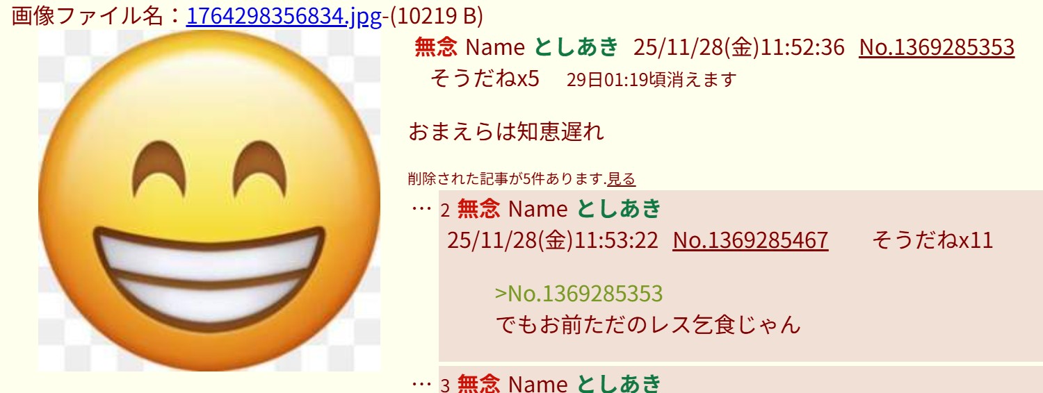 | … | 97無念Nameとしあき25/11/28(金)13:39:50No.1369304341そうだねx3頑張って馬鹿にしようともするも物を知らなすぎて逆に馬鹿にされる間抜けなスレ豚の図 |