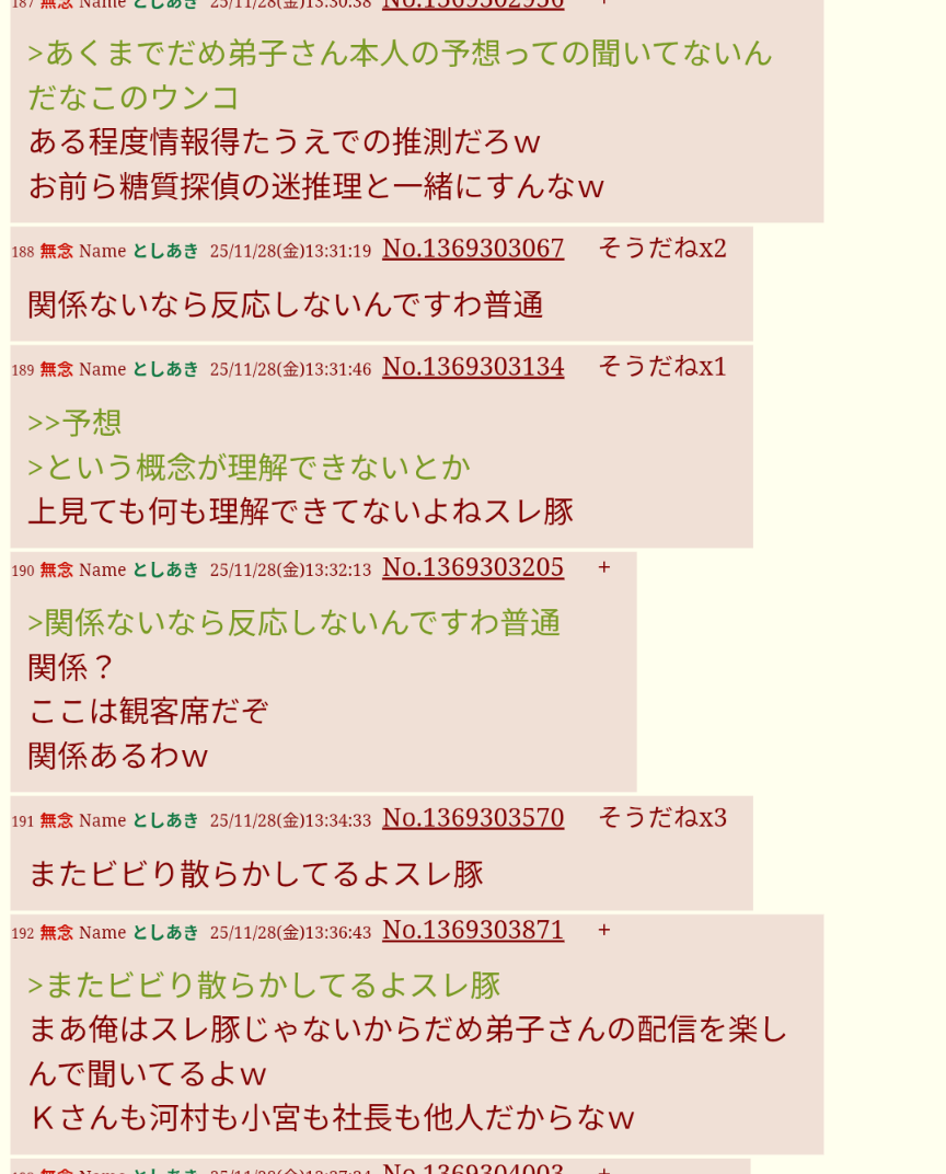 | … | 133無念Nameとしあき25/11/28(金)14:06:58No.1369308307+>現実逃避の為にはなんでもするんだなスレ豚こと河村くんは… |
