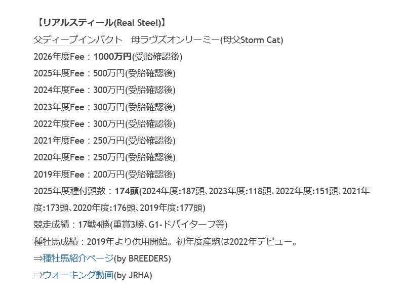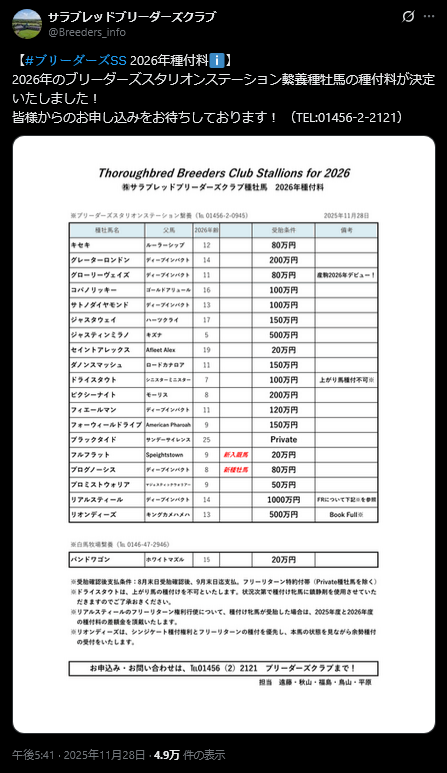 | … | 11無念Nameとしあき25/11/28(金)20:13:20No.1369376602そうだねx13 1764328400359.jpg-(83638 B) 【ブリーダーズ・スタリオンステーション】の「2026年度シーズン種付料」が発表 |