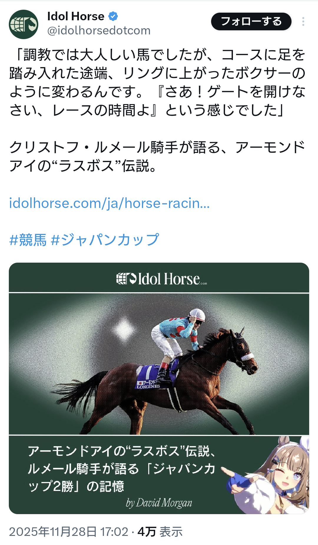 | … | 44無念Nameとしあき25/11/28(金)20:37:49No.1369383498そうだねx4 1764329869061.png-(1125543 B) https://x.com/idolhorsedotcom/status/1994315850308817249 |