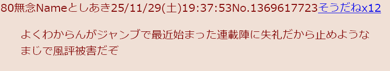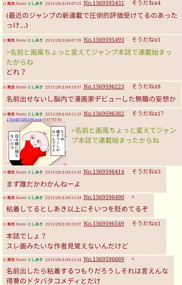 | … | 7無念Nameとしあき25/11/29(土)22:17:01No.1369665144そうだねx3ジャンプ作家のなりすましってコト!? |