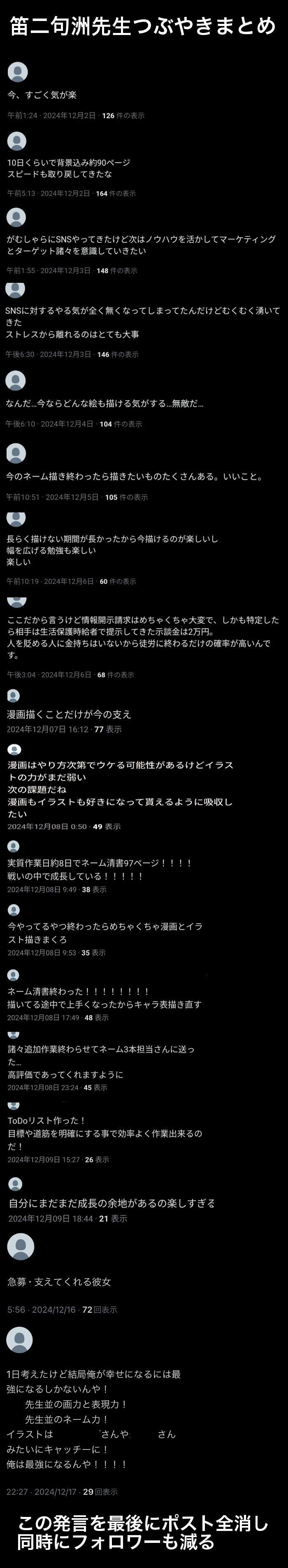| … | 29無念Nameとしあき25/11/29(土)23:22:20No.1369684464そうだねx1>自己啓発やらライフハック的なトピックを散々漫画にしてきたが自分は一つも活かせずに落ちぶれて壊れた人のスレ? |
