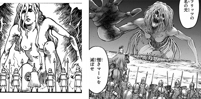 | … | 115無念Nameとしあき25/11/30(日)15:25:24No.1369828121+ 1764483924256.jpg-(145934 B) 「進撃の巨人」で「女の乳首」が描かれたのって始祖ユミルの巨人のイメージ画(画像左)ぐらいかな? |