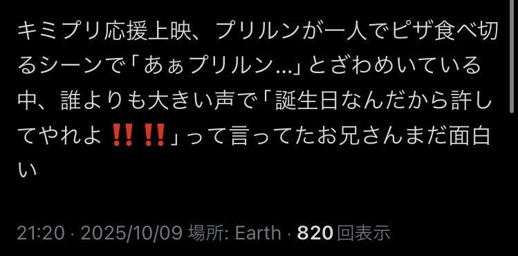 | … | 124無念Nameとしあき25/12/01(月)19:40:03No.1370112759+応援上映でプリルンがピザを食べつくすシーンであーってみんなで盛り上がったのはいい思い出 |