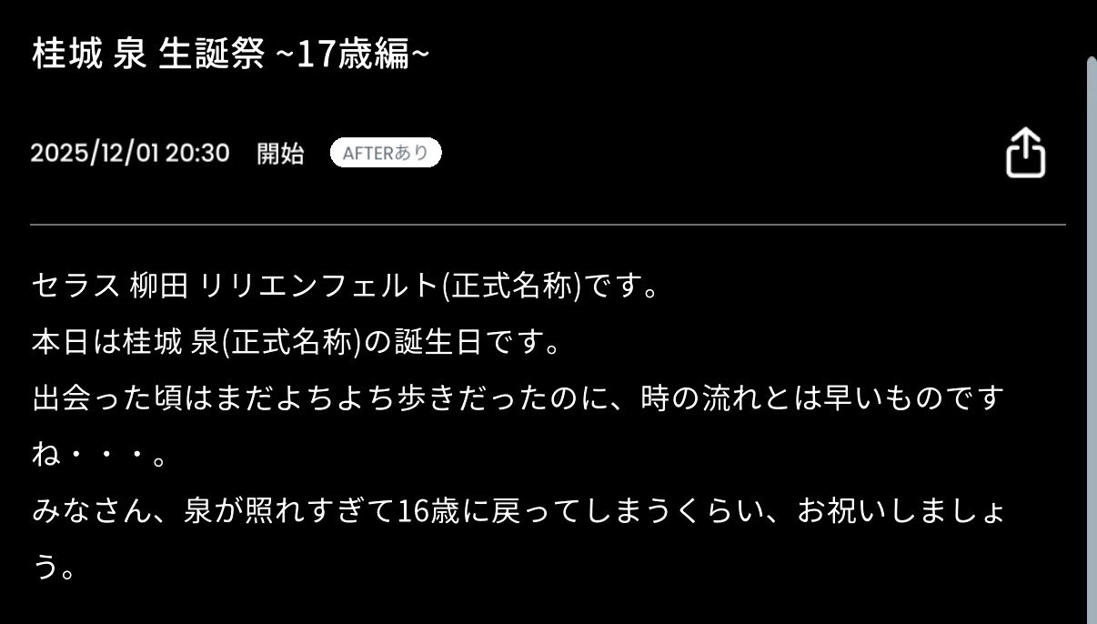 | … | 67無念Nameとしあき25/12/01(月)22:48:41No.1370168233+ 1764596921342.jpg-(340466 B) >こんばんは!泉先輩、お誕生日おめでとうございます! |