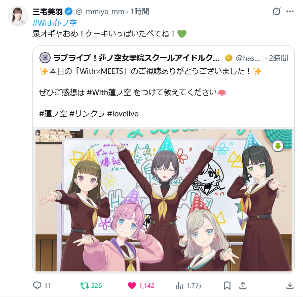 | … | 75無念Nameとしあき25/12/02(火)00:05:14No.1370184881+ 1764601514271.png-(1534836 B) >今日は蓮ノ空のクールで庶民的なお姉さん♪泉ちゃんのお誕生日!本当におめでとう〜!! |