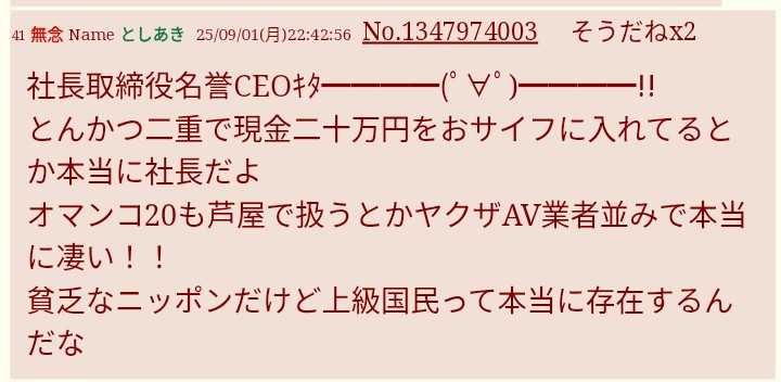 | … | 9無念Nameとしあき25/12/01(月)20:20:20No.1370124483+スレ豚が言うには社長スレは釣りだそうだ |