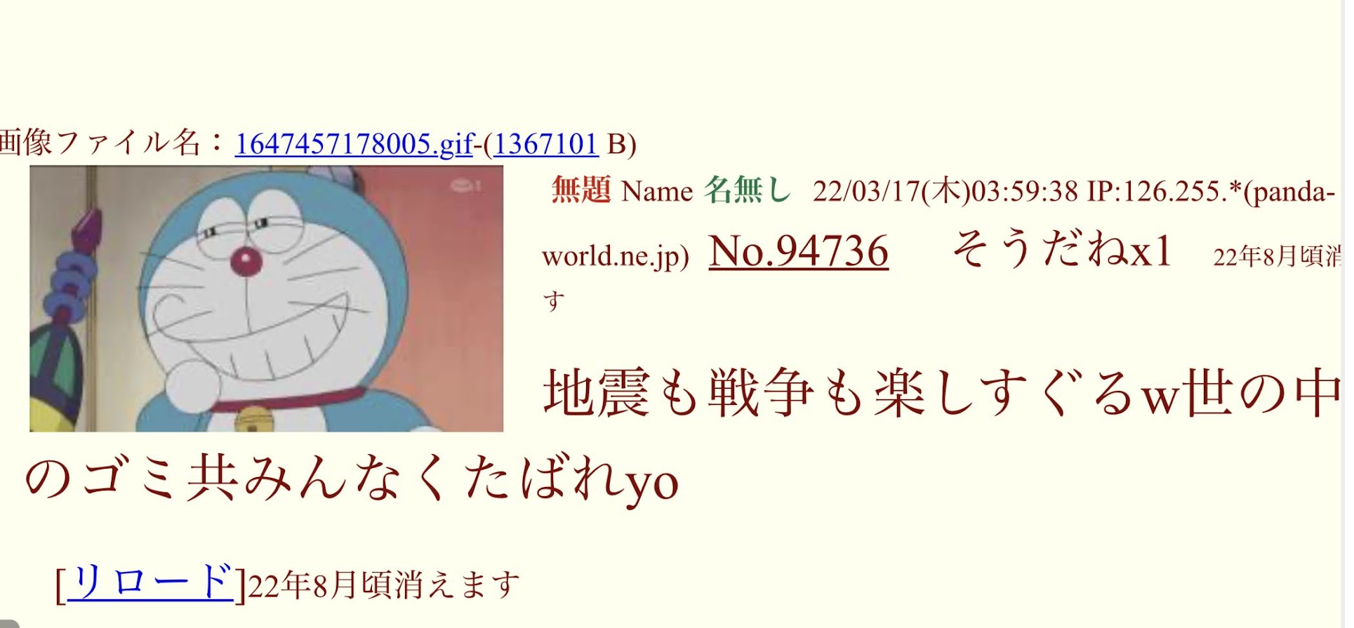 | … | 64無念Nameとしあき25/12/02(火)00:49:05No.1370191467+>毎日繰り返されるスレ豚と17人衆の生存確認 |