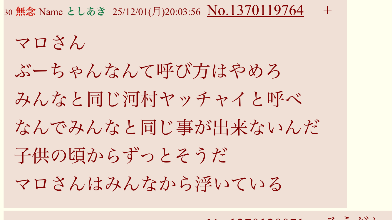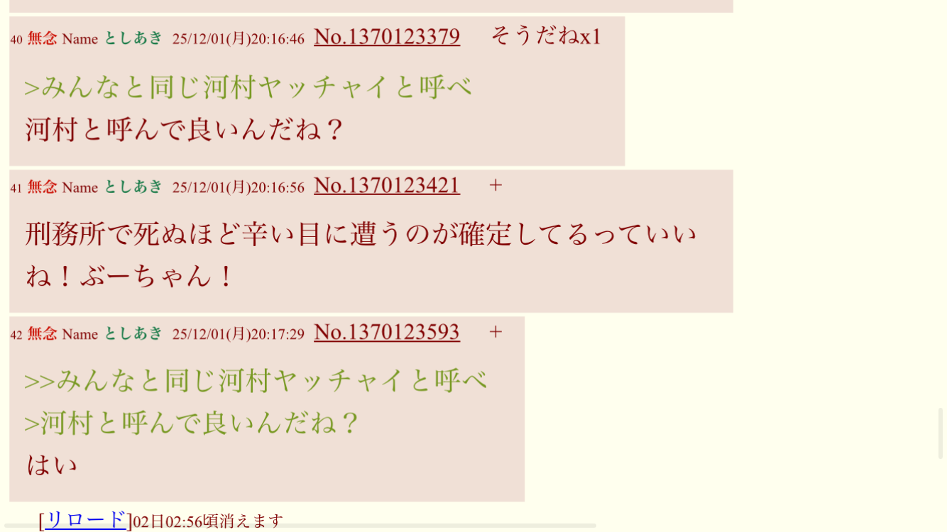 | … | 55無念Nameとしあき25/12/02(火)00:40:42No.1370190416+>>河村と呼んで良いらしい |