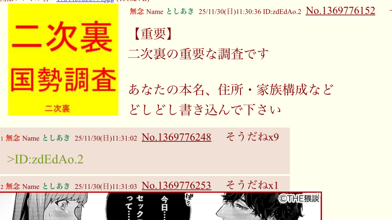 | … | 18無念Nameとしあき25/12/04(木)12:07:15No.1370684557+二次裏も日に日に頭のおかしな人が増えていくな |