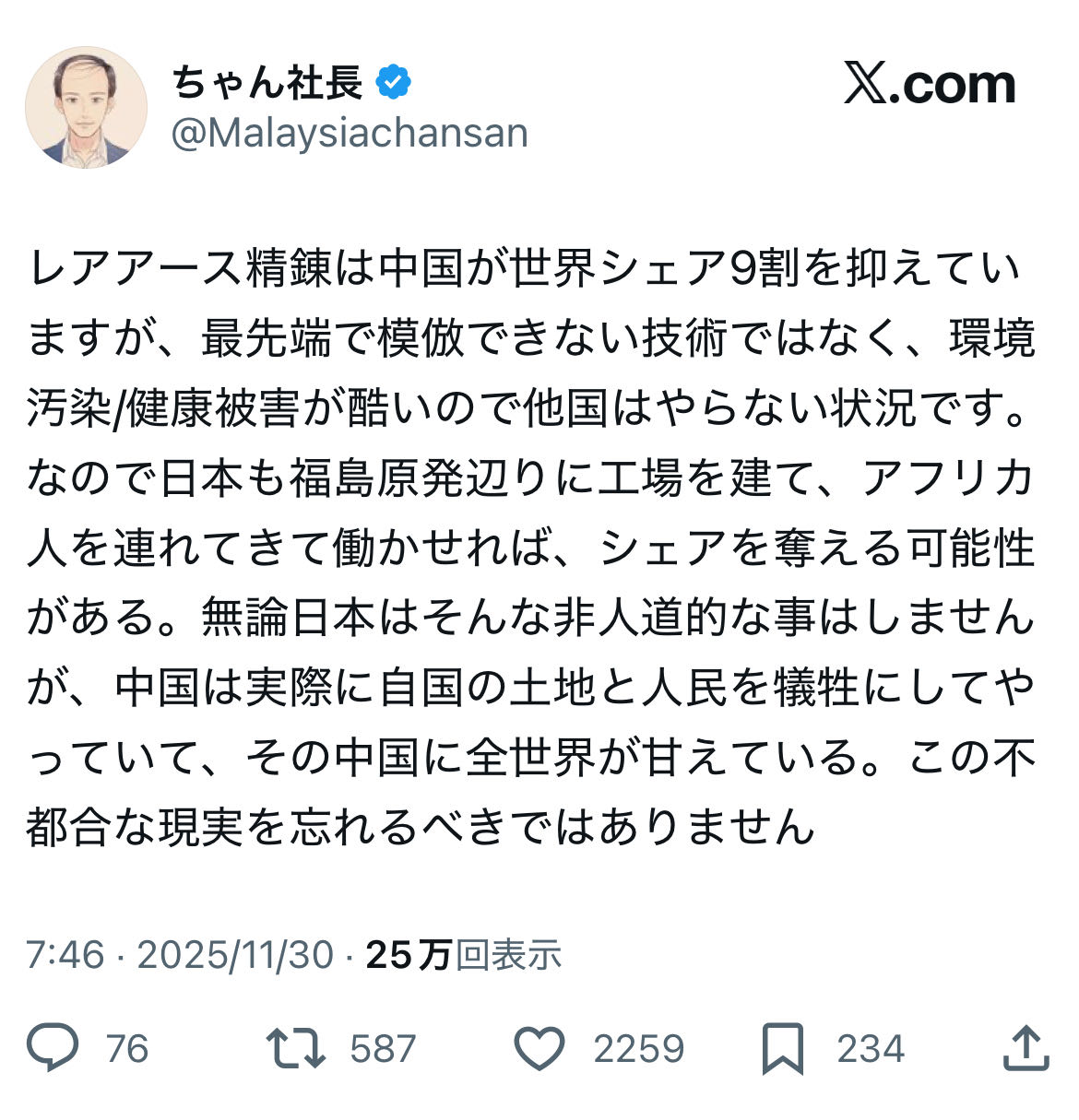 | … | 27無念Nameとしあき25/12/05(金)13:28:22No.1370910715+レアアースは精錬に環境汚染とか放射能とかの環境やら人権意識が高い先進国だと難しいと思うけどな |