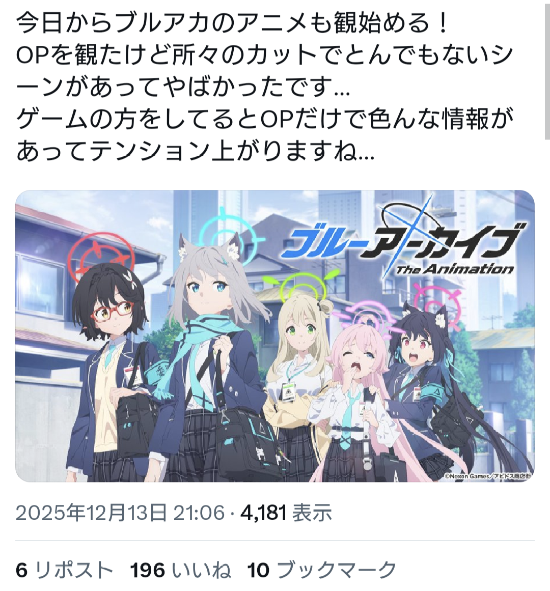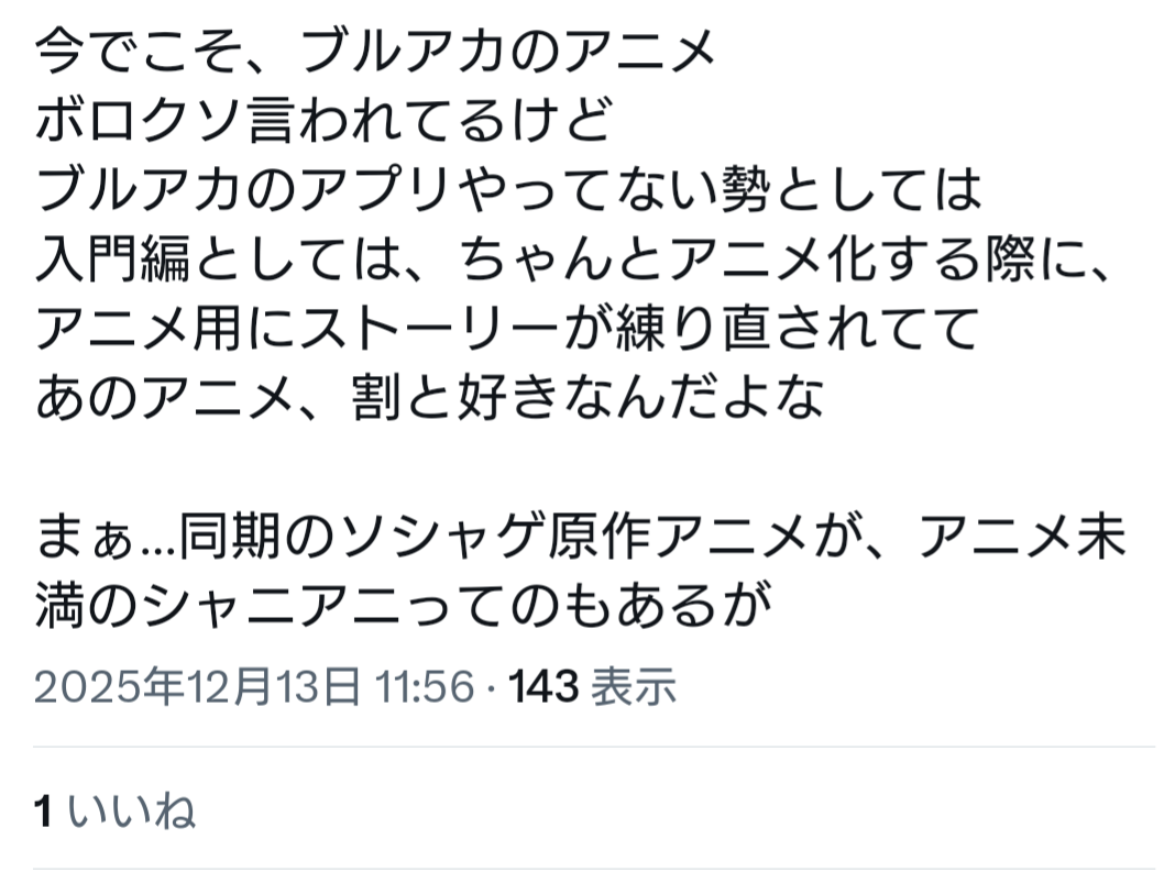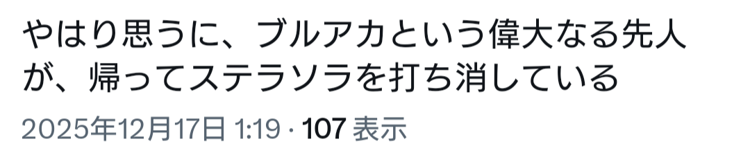| … | 358無念Nameとしあき25/12/17(水)13:22:44No.1373666129そうだねx2ブルアカ自体が今単品で褒めるの難しいからな… |