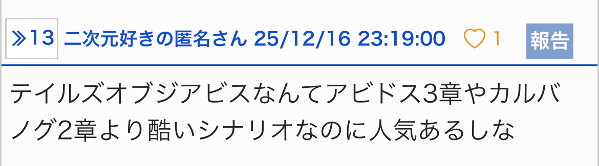 | … | 51無念Nameとしあき25/12/17(水)11:47:44No.1373647424そうだねx7アビスが色々言われるのは分かるけどブルアカ以下は絶対ねぇよ |