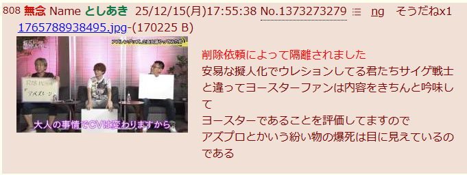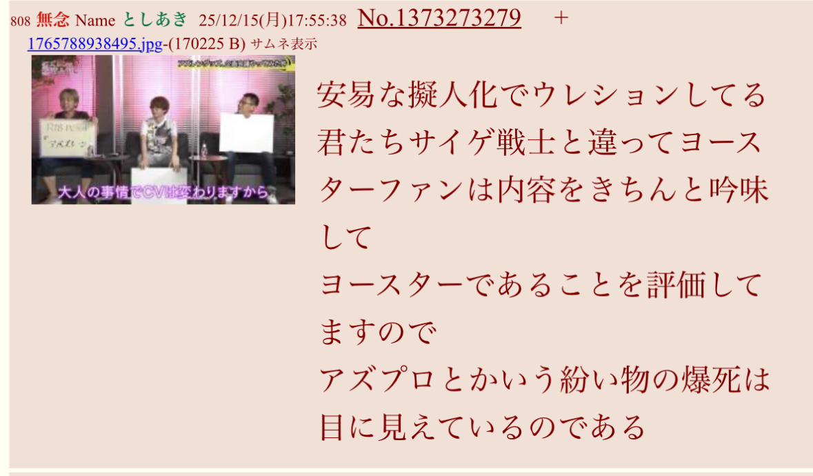 | … | 427無念Nameとしあき25/12/17(水)14:22:13No.1373675111そうだねx1先生達がアズプロをヨースターだから覇権だなんだって持ち上げてるけどさ |
