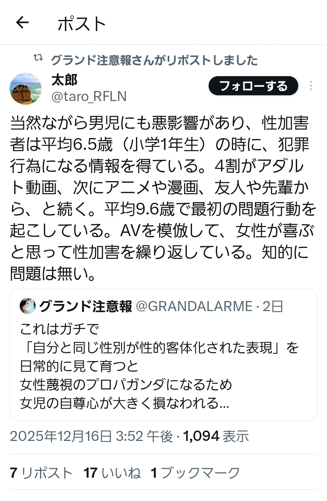 | … | 10無念Nameとしあき25/12/17(水)23:05:47No.1373799820+性犯罪者に対して「犯罪行為(おそらく性犯罪の意)を何歳ごろに知ったか」っていつ誰が定量的なアンケートを取っているんですかね |