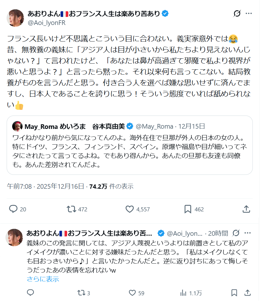 | … | 15無念Nameとしあき25/12/18(木)04:04:15No.1373832933そうだねx2フランスに住んでる奴がフランスアイコンなんて付けてる訳がない |
