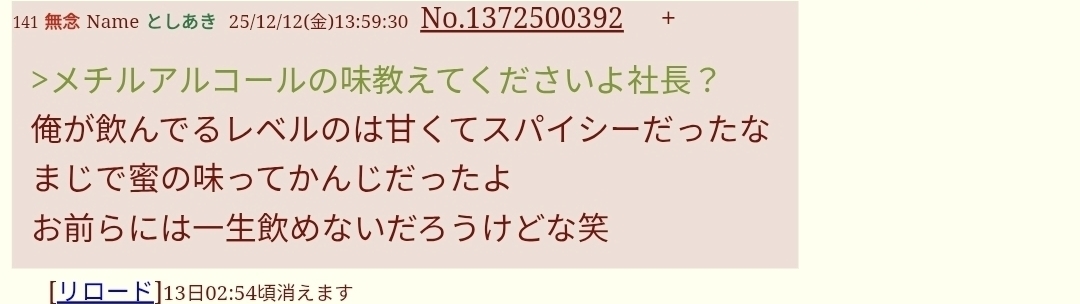 | … | 49無念Nameとしあき25/12/20(土)03:53:02No.1374256531そうだねx1メチルアルコール飲むとか言ってるのもアレだし |