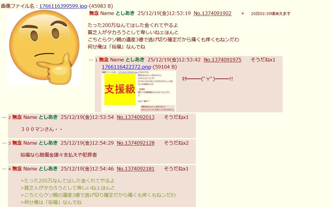 | … | 53無念Nameとしあき25/12/20(土)04:34:10No.1374257568+>自業自得で200万払う羽目になった爺さんおもろいw |