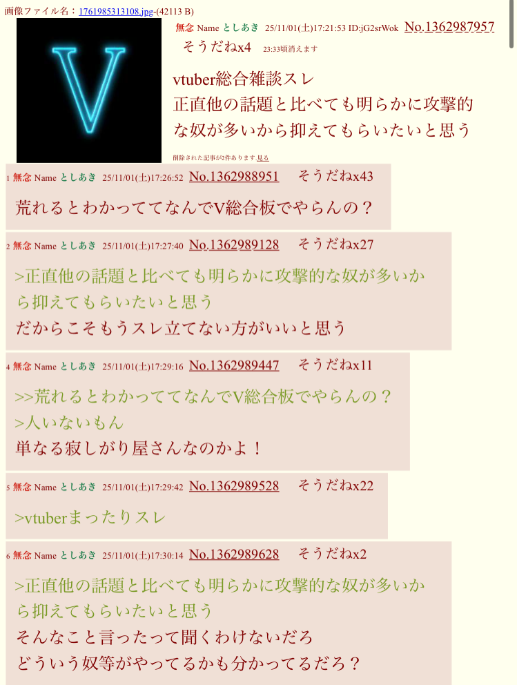 | … | 43無念Nameとしあき25/12/23(火)09:35:07No.1375006112そうだねx3>Vtuberについて普通に話したいのに(今Vtuber流行ってるんだ〜とかどんな子が今人気なのとか) |
