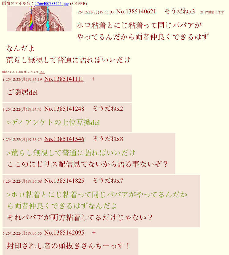 | … | 82無念Nameとしあき25/12/23(火)10:12:04No.1375010332そうだねx2にじさんじ叩きだけは許せない正義の第三者さん |