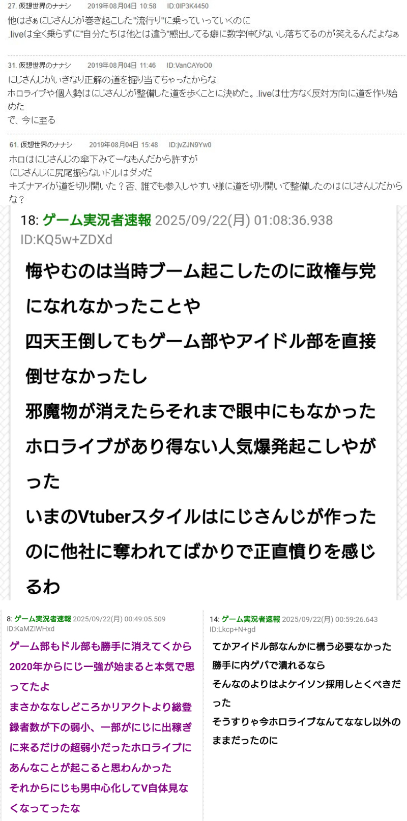 | … | 60無念Nameとしあき25/12/23(火)09:52:15No.1375008041そうだねx3四天王討伐やらアイドル部崩壊やらで業界1位を掲げて「これからはにじさんじに従った事務所だけが生き残れる」とかイキリまくってた頃が忘れられないんだろうな…って人は結構いる |