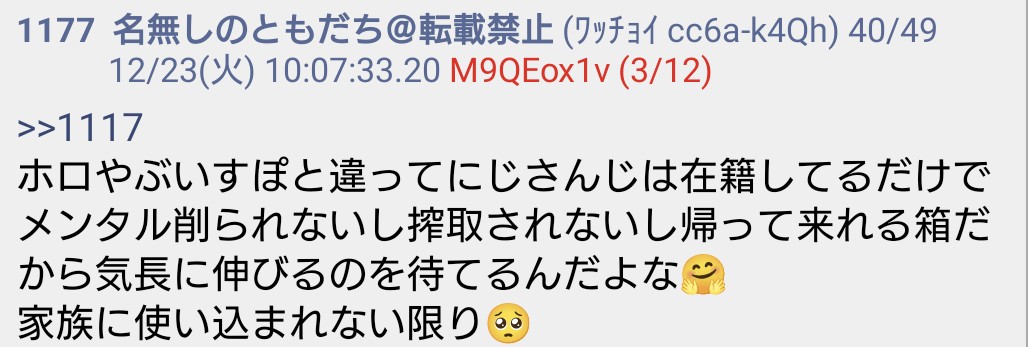 | … | 155無念Nameとしあき25/12/23(火)10:34:52No.1375012975+>ホロリスみたいな全肯定しかいない箱じゃないからな |