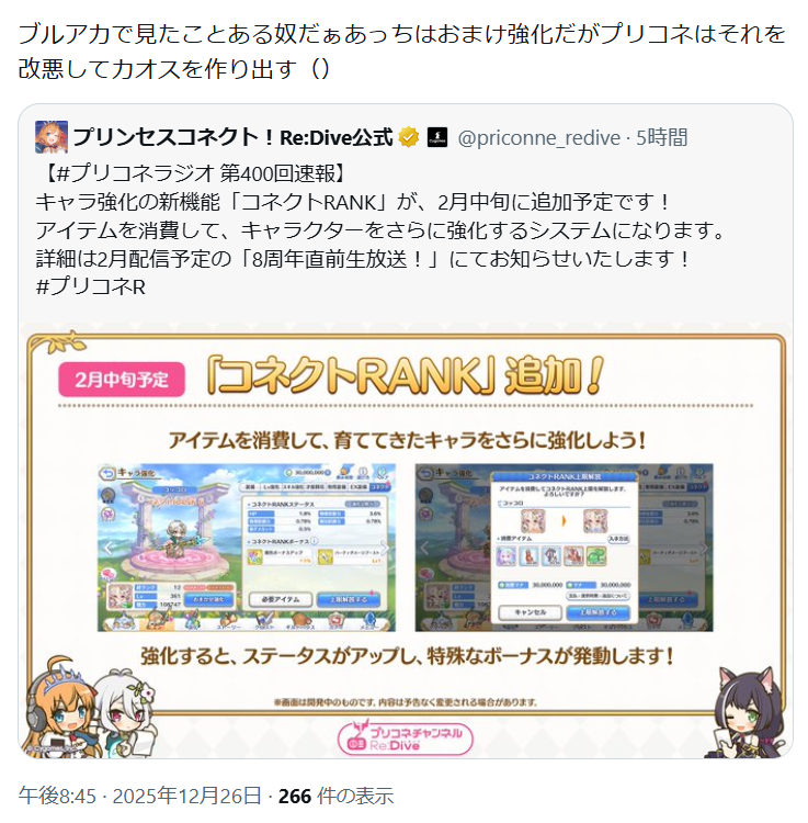 | … | 176無念Nameとしあき25/12/27(土)02:06:42No.1375819858+コネクトRANKは見た感じ強化範囲が広くなった専用装備3みたいな位置付けじゃないかと思うがブルアカなら愛用品か固有武器ってところかね |