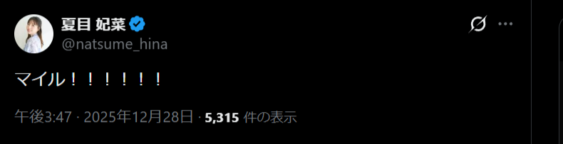 | … | 41無念Nameとしあき25/12/28(日)16:04:23No.1376163705+>だからマイル禁止だっつってんだろ |