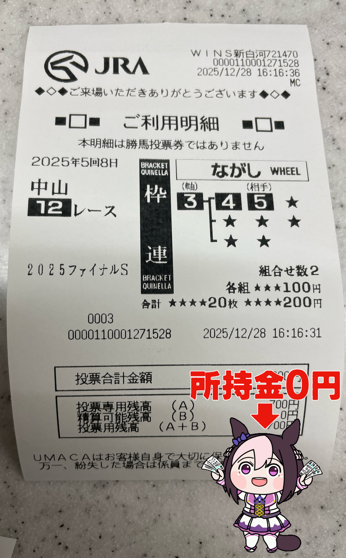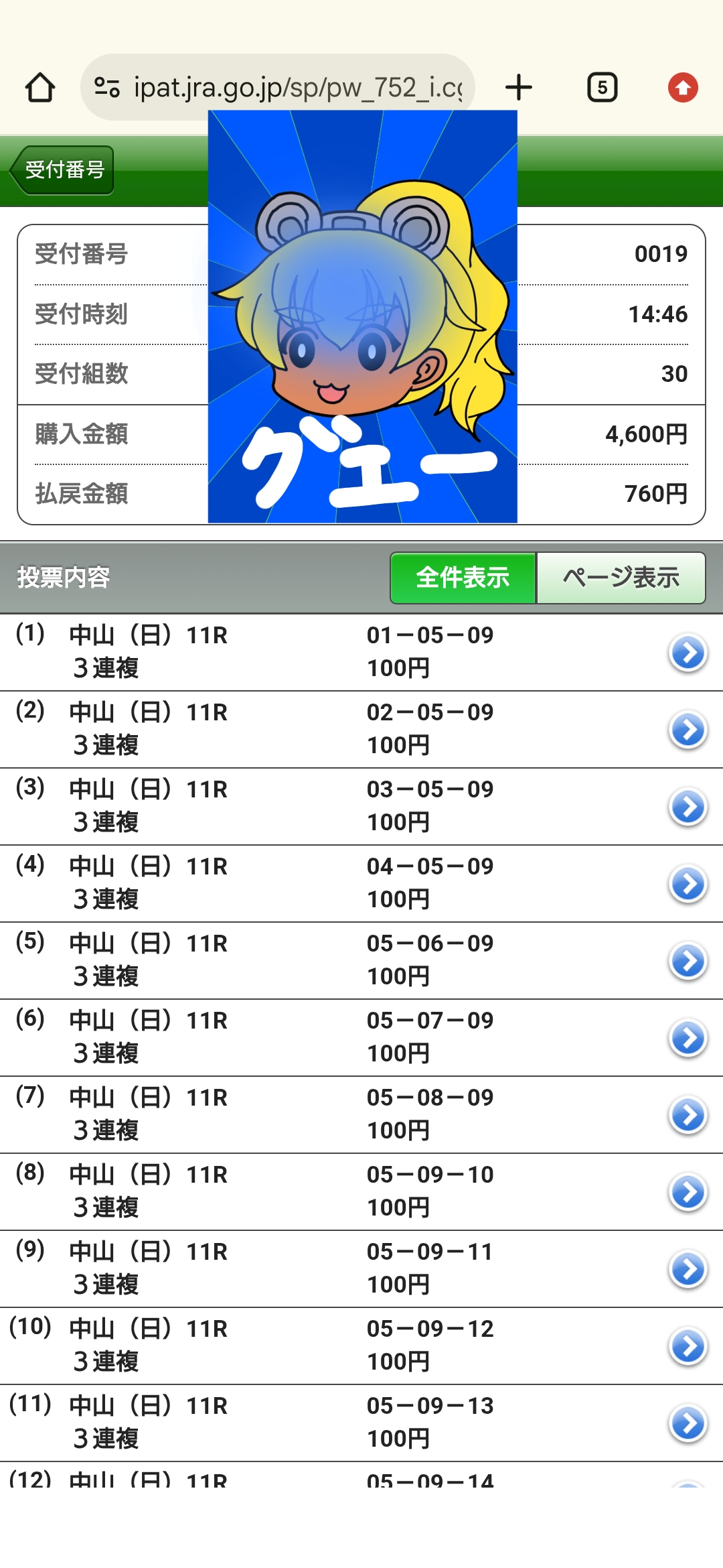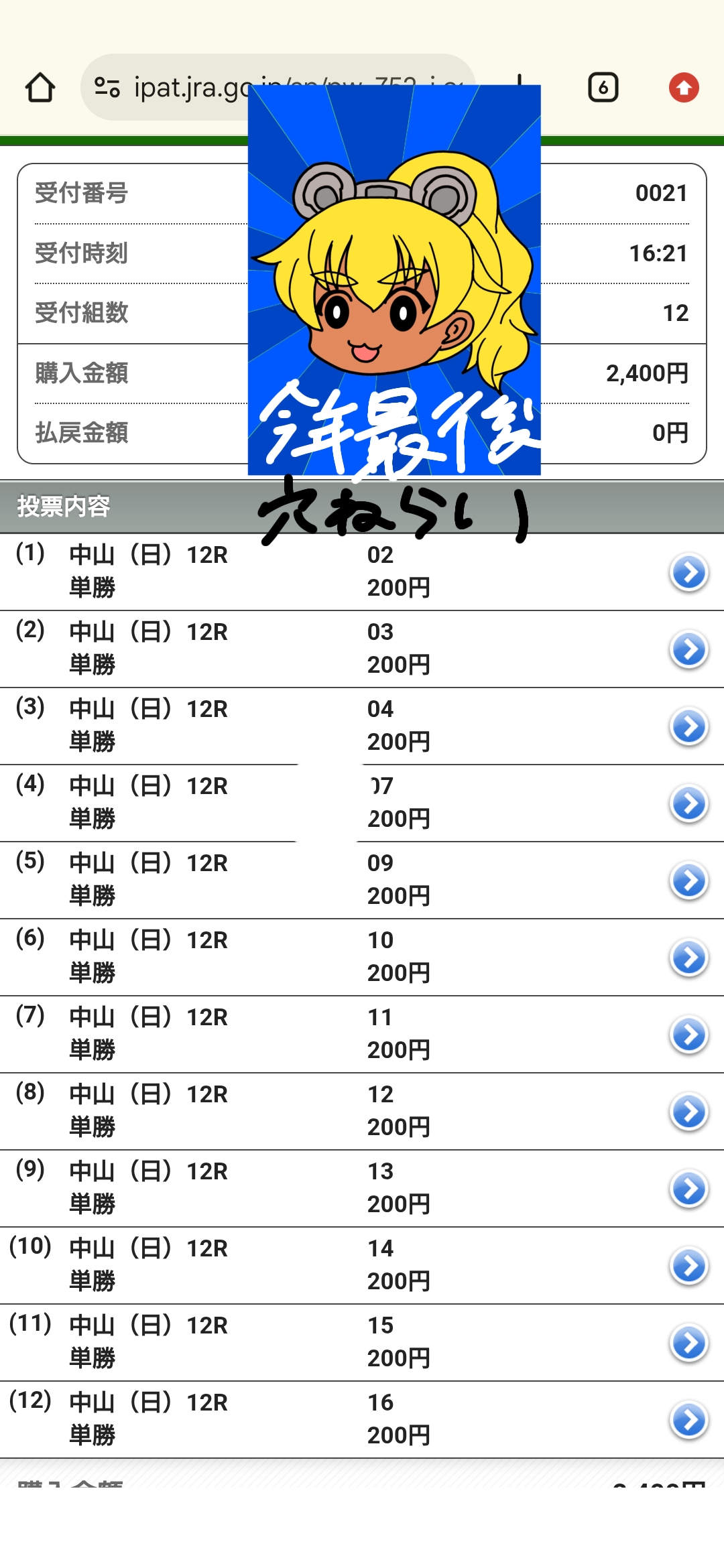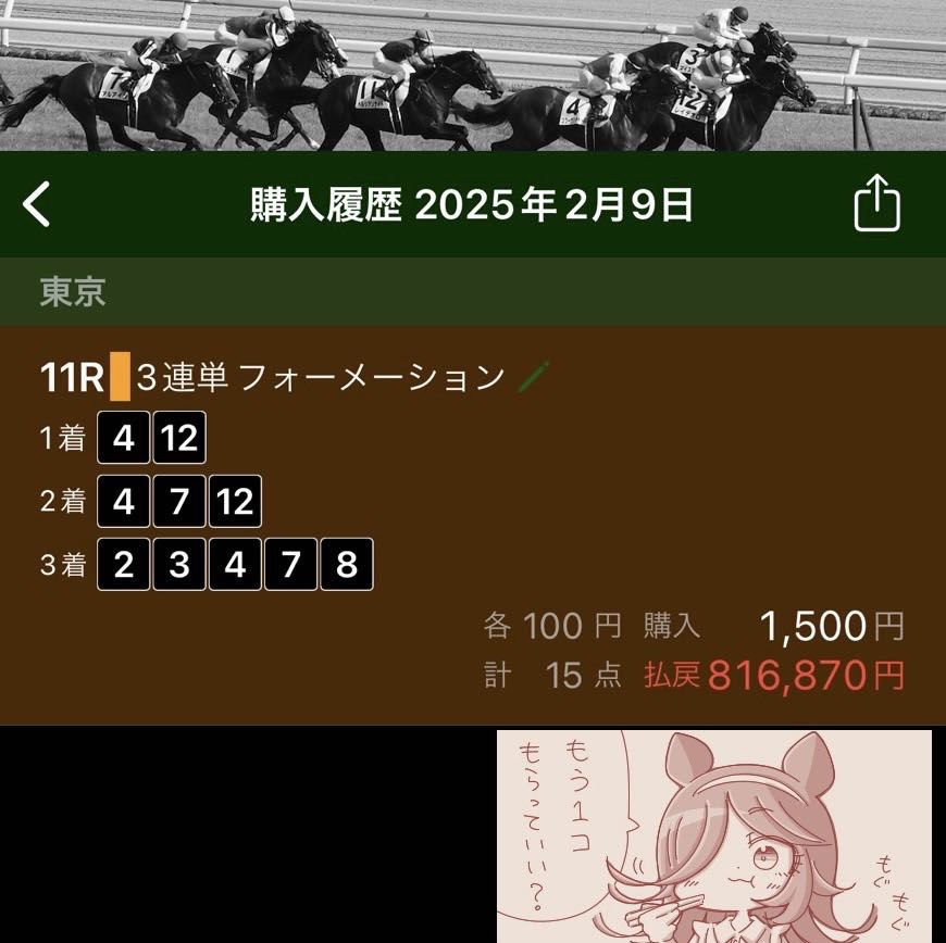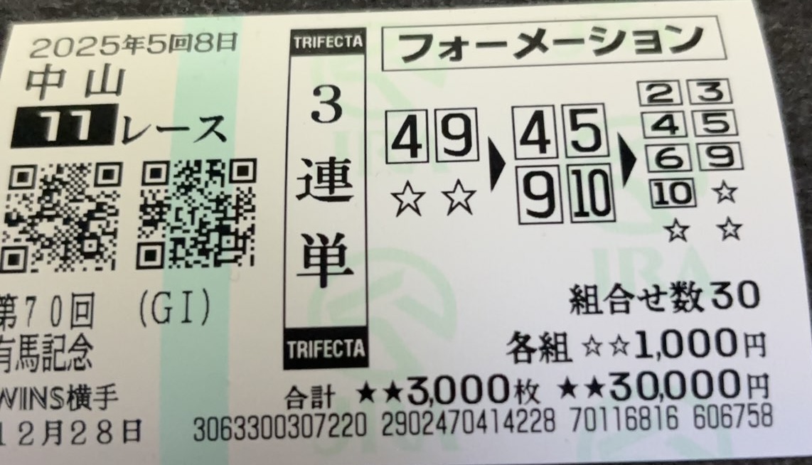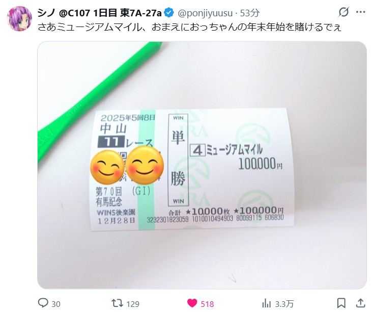 | … | 980無念Nameとしあき25/12/28(日)17:11:03No.1376178956+ 1766909463432.png-(4914067 B) ウインズからの帰宅やら何やらで今になりましたが有馬記念当てられました |