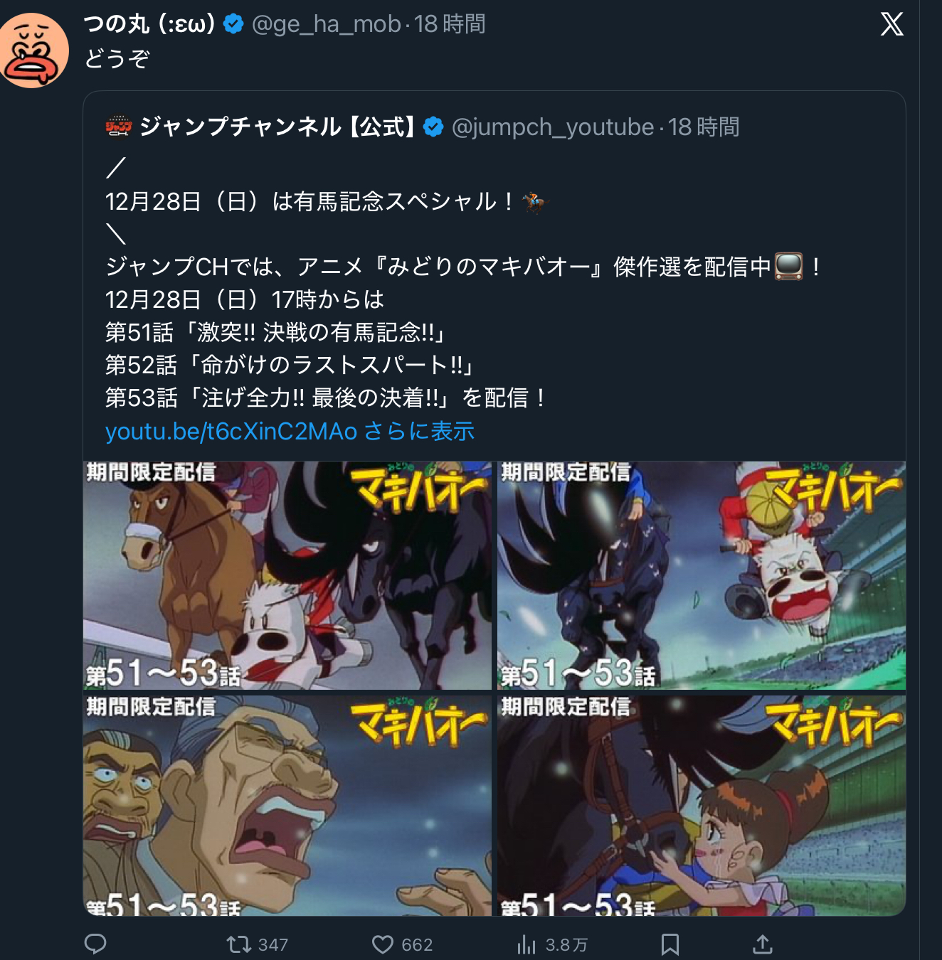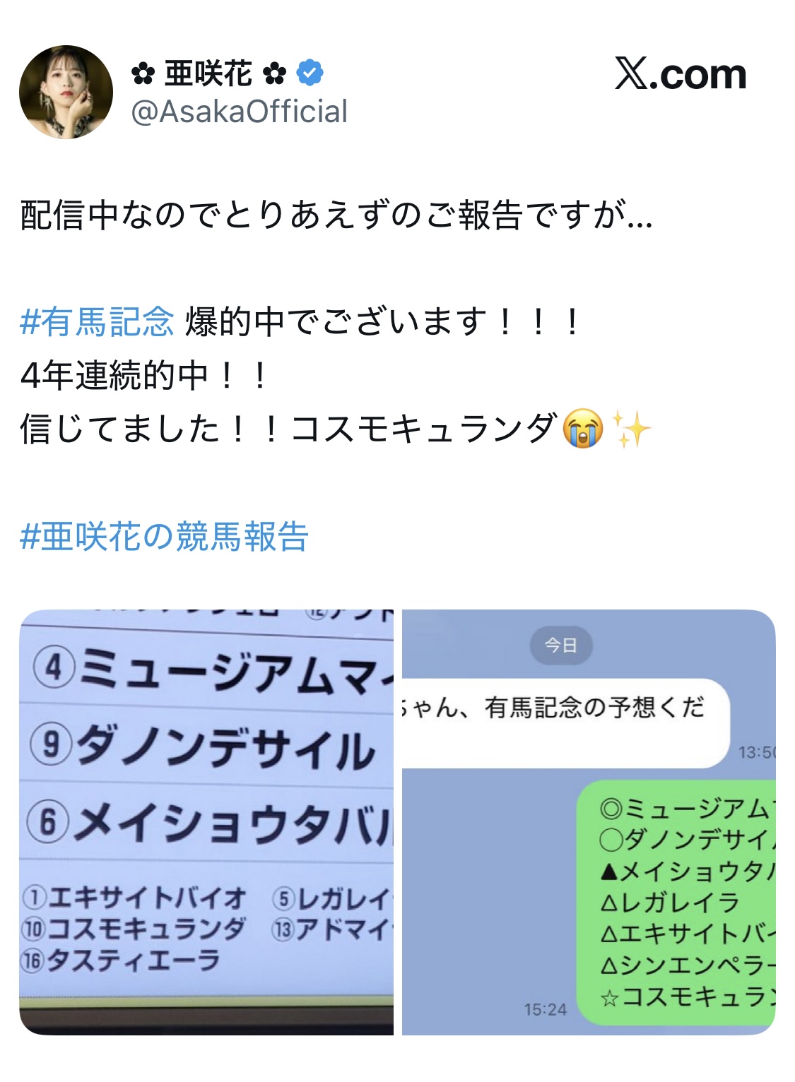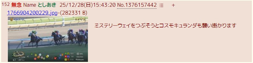 | … | 951無念Nameとしあき25/12/28(日)17:07:27No.1376178135+BS11で有馬のタイムライン言われてるの笑う |