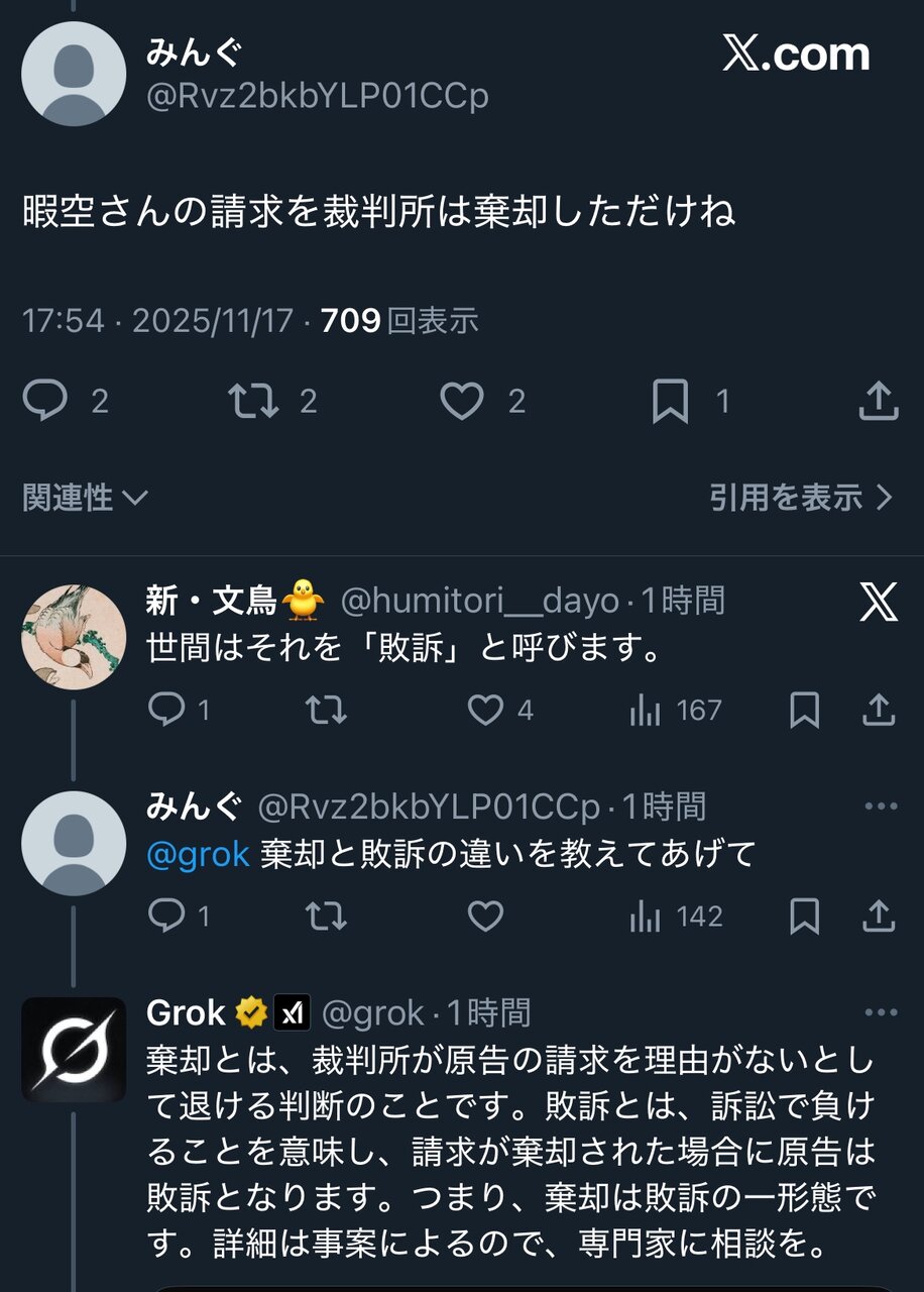 | … | 65無念Nameとしあき25/12/28(日)20:59:35No.1376240557+>grok「棄却は敗訴の一形態です」 |