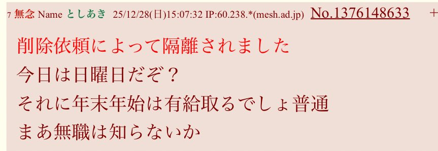 | … | 93無念Nameとしあき25/12/28(日)21:10:20No.1376243647そうだねx3仕事納めは26日じゃないの? |