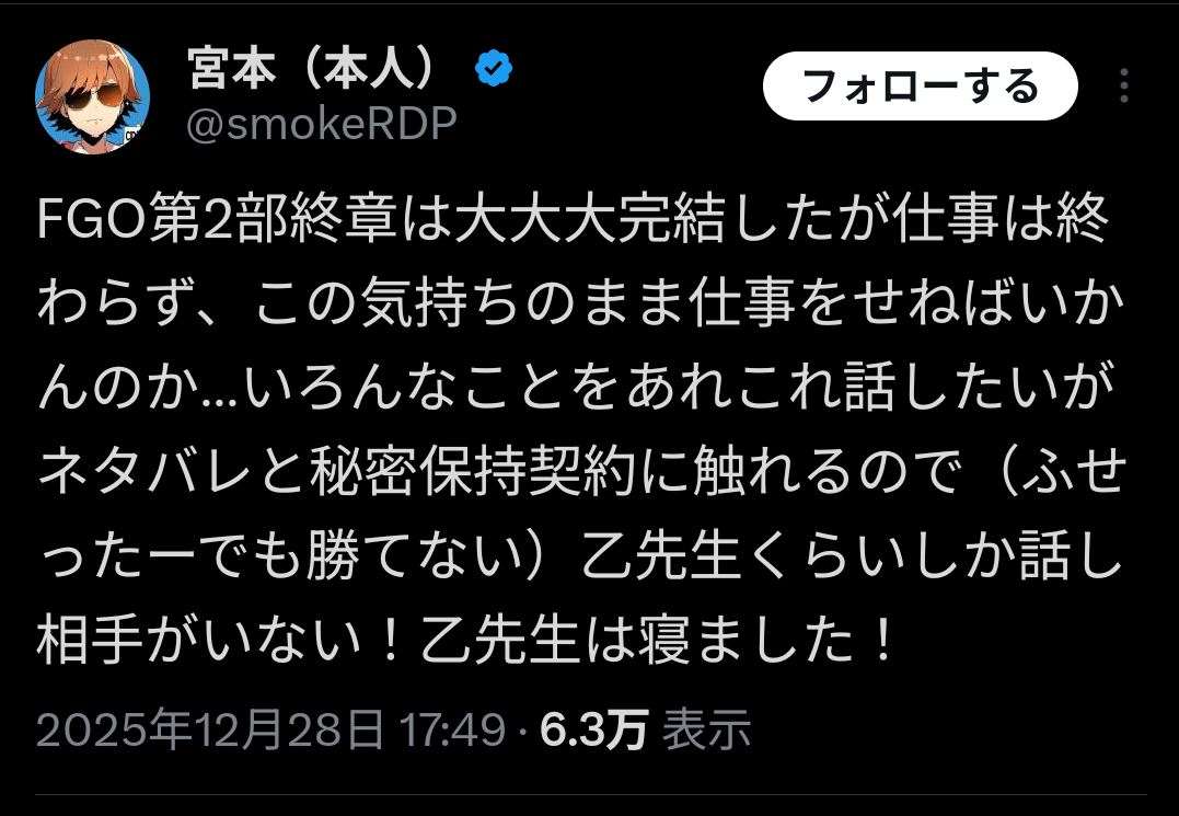 | … | 916無念Nameとしあき25/12/29(月)00:23:49 IP:153.131.*(ocn.ne.jp)No.1376290997+奈須きのこ「FGO第3部のシナリオは武論尊先生が担当します!お楽しみください!」 |