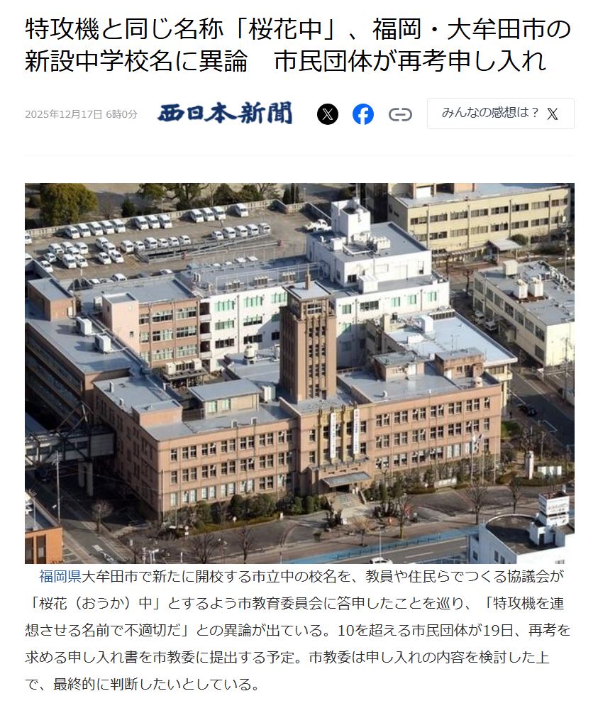 | … | 144無念Nameとしあき25/12/29(月)00:01:28No.1376286673そうだねx1 1766934088005.png-(564620 B) >特攻機と同じ名称「桜花中」、福岡・大牟田市の新設中学校名に異論 市民団体が再考申し入れ |