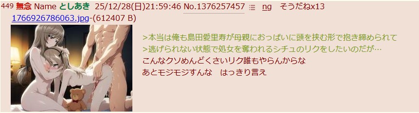 | … | 983無念Nameとしあき25/12/29(月)07:47:27No.1376319421+ 1766962047540.png-(1393237 B) >朝の景気付けにデカパイの女の子のおっぱいをちゅぱちゅぱ吸わせてください |