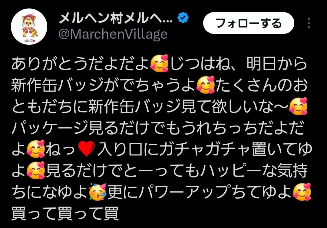 | … | 54無念Nameとしあき25/12/29(月)00:21:18No.1376290528+>メルヘン村の缶バッジってこんなのだぞ… |