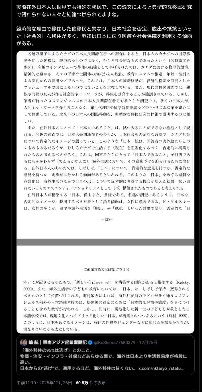 | … | 80無念Nameとしあき25/12/29(月)13:21:25No.1376373638+ちなみに日本脱出できないよう外国語教育を先進国最低レベルにしてる |