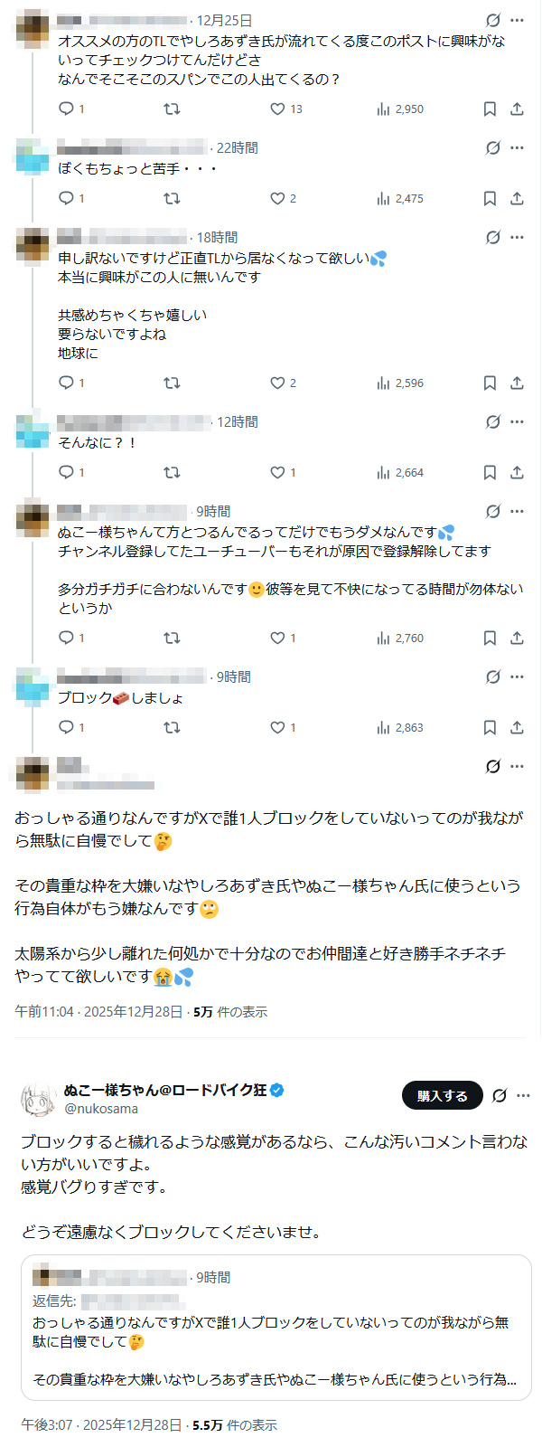 | … | 157無念Nameとしあき25/12/29(月)22:04:45 IP:106.133.*(au-net.ne.jp)No.1376494592そうだねx7雑に一人称と語尾だけ変えた同一IPの定型文が別人に見えるなら病院行った方がいいよ |